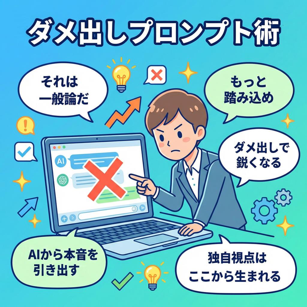 AIにその角度を出させるには、意図的に「平均から外れる方向」へ押し込む圧力が必要だ。その圧力をかけるのが、ダメ出しプロンプトという技術である。