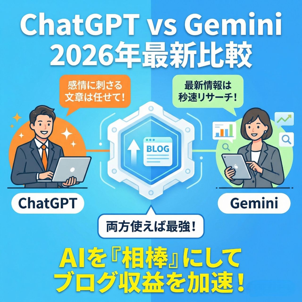 結論から言おう。ChatGPTとGeminiは「競合」ではない。「役割の違う相棒」だ。ブログ運営や副業の現場で成果を出す人は、この違いを直感ではなく“戦略”として理解している。どちらが賢いかではなく、「どの工程で使うと利益に直結するか」を考えることが重要だ。
