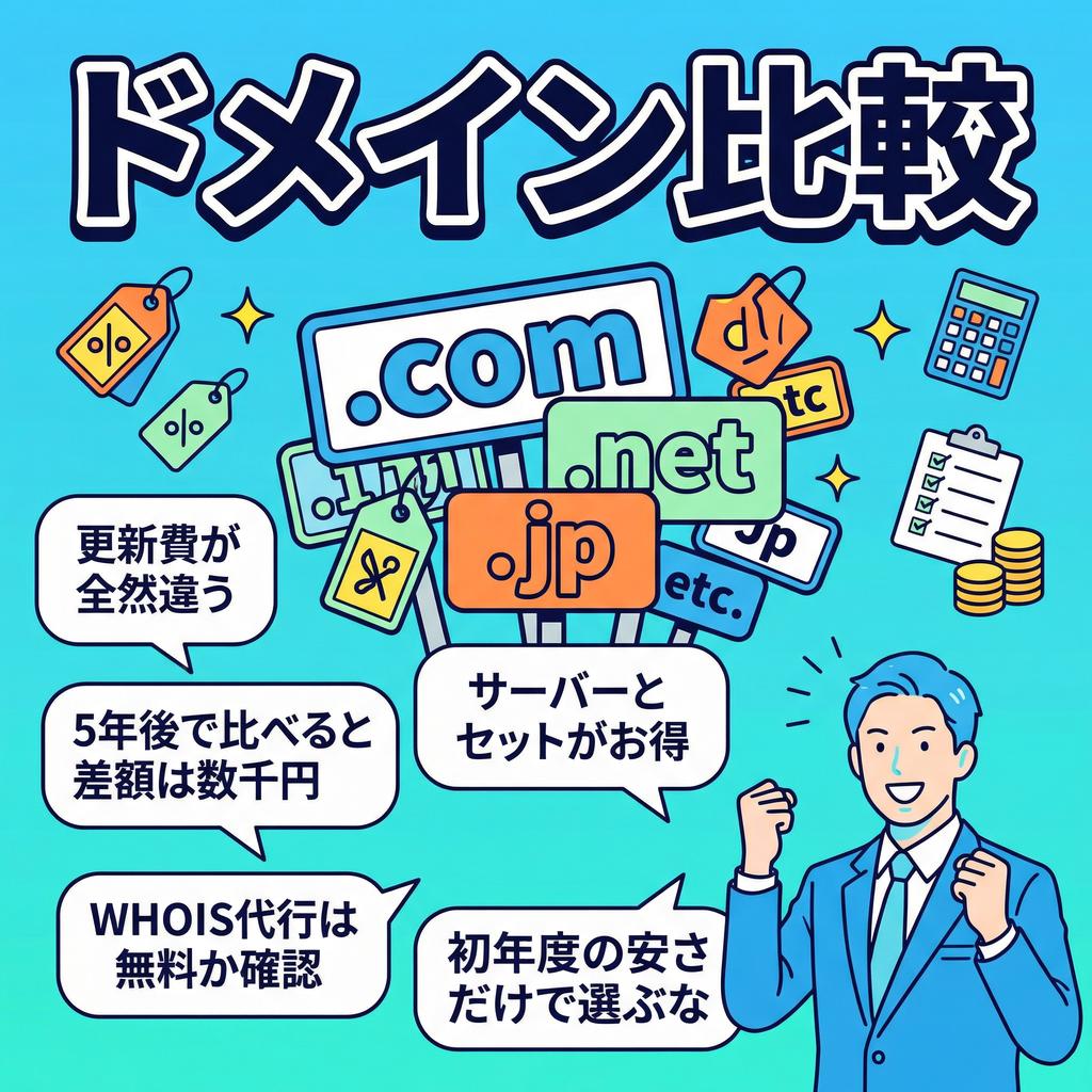ドメインサービスのよくある落とし穴は、初年度キャンペーン価格と2年目以降の更新価格の乖離だ。たとえば、.comドメインを初年度160円で取得しても、2年目以降の更新が1,408円というケースは珍しくない。5年運用すれば差額は数千円にのぼる。