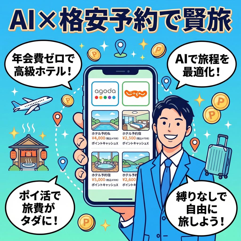 AIで旅程を最適化し、agodaやじゃらんnetで同クラスのホテルをリーズナブルに予約し、ポイ活で旅費をさらに圧縮する。この流れを一度体験してしまうと、「年会費を払い続けて縛りの中で旅をする必要があるのか」という問いへの答えが、自然と見えてくるかもしれません。