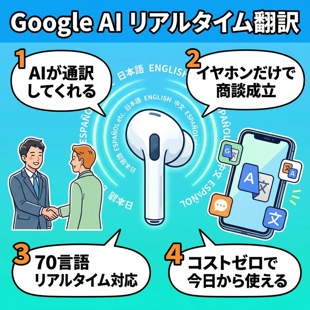一方、GoogleのAIリアルタイム翻訳の優位性は明確だ。バックエンドにGeminiという巨大な言語知性を持つことで、単なる翻訳精度の問題を超えた「文脈理解の深さ」を実現している。ビジネスの現場で飛び交う専門用語、業界特有の慣用句、会話の流れから読み取るべきニュアンス。これらを総合的に処理できるのは、LLMをコアに持つGoogleならではの強みだ。