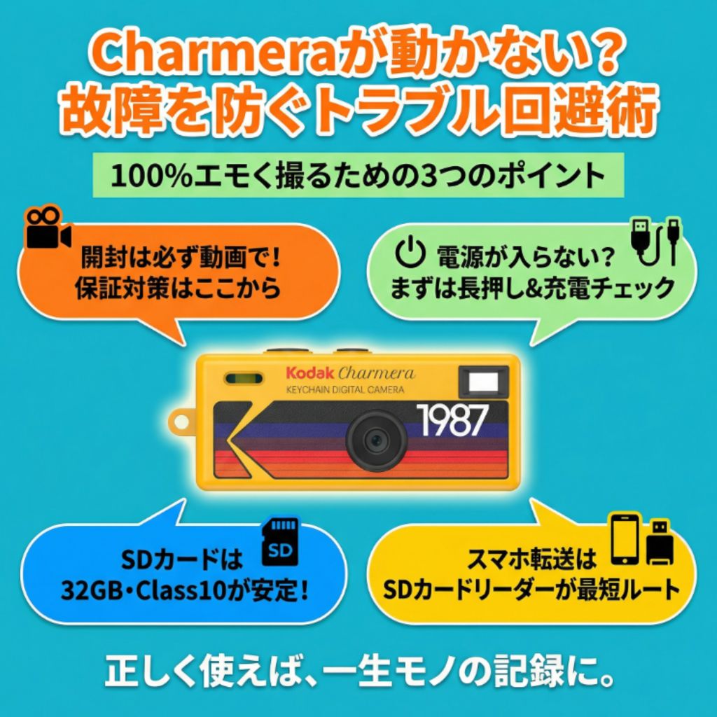 結論から言います。SDカードは「32GB・Class10」を選んでください。大容量カードは正常認識されないリスクが高く、特に信頼の日本ブランドであるKIOXIA(キオクシア)製が、チャーメラとの相性において最も安定しています。