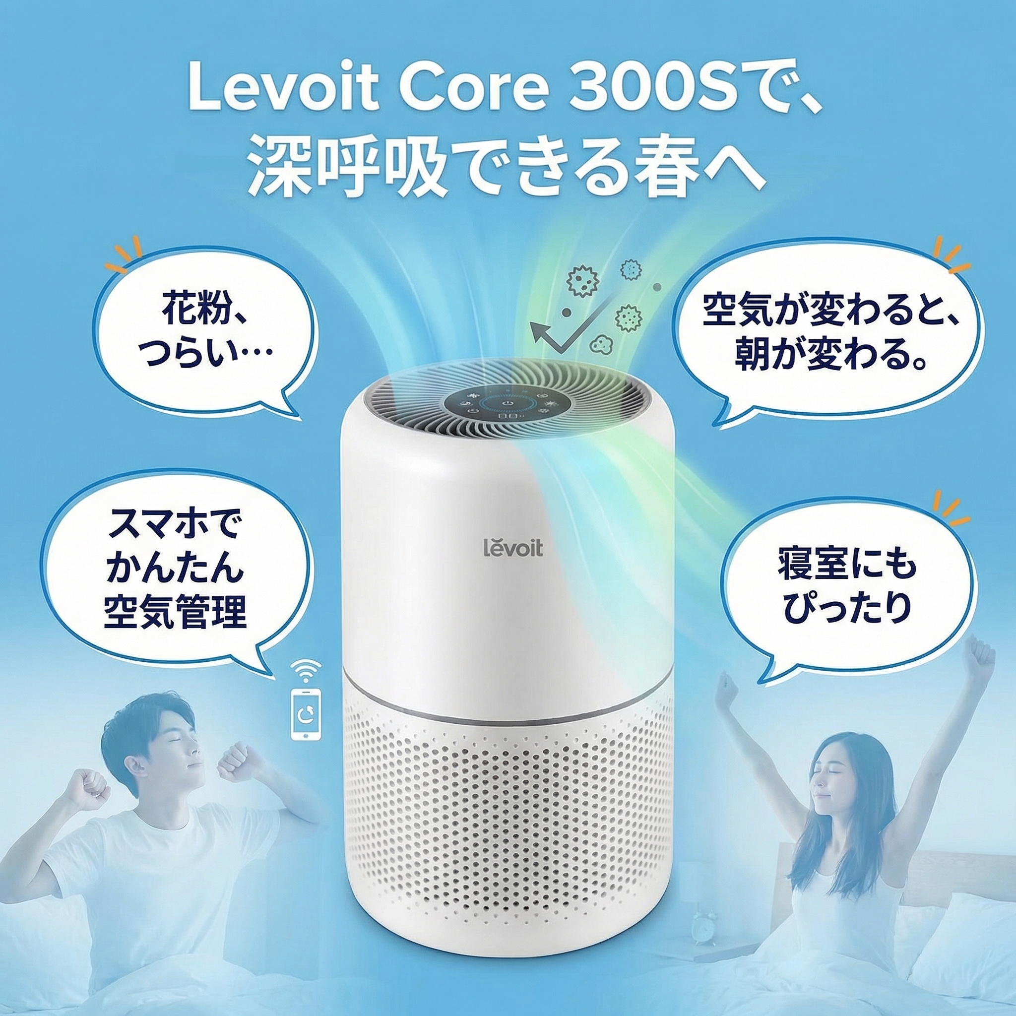 朝起きた瞬間、鼻がムズムズする。くしゃみが止まらない。目がかゆい。窓を開けて空気を入れ替えたいのに、外の空気が怖い――そんな花粉やハウスダストの悩みを抱えたまま、春を迎えていませんか?2026年2月、いよいよ花粉シーズン本番が近づいてきました。「今年こそは、部屋の中だけでも快適に過ごしたい」。そう感じている方にこそ知ってほしいのが、空気清浄機 Levoit Core 300S の実力です。コンパクトな見た目からは想像できないほどの清浄力で、あなたの生活空間を“深呼吸したくなる空気”に変えてくれます。