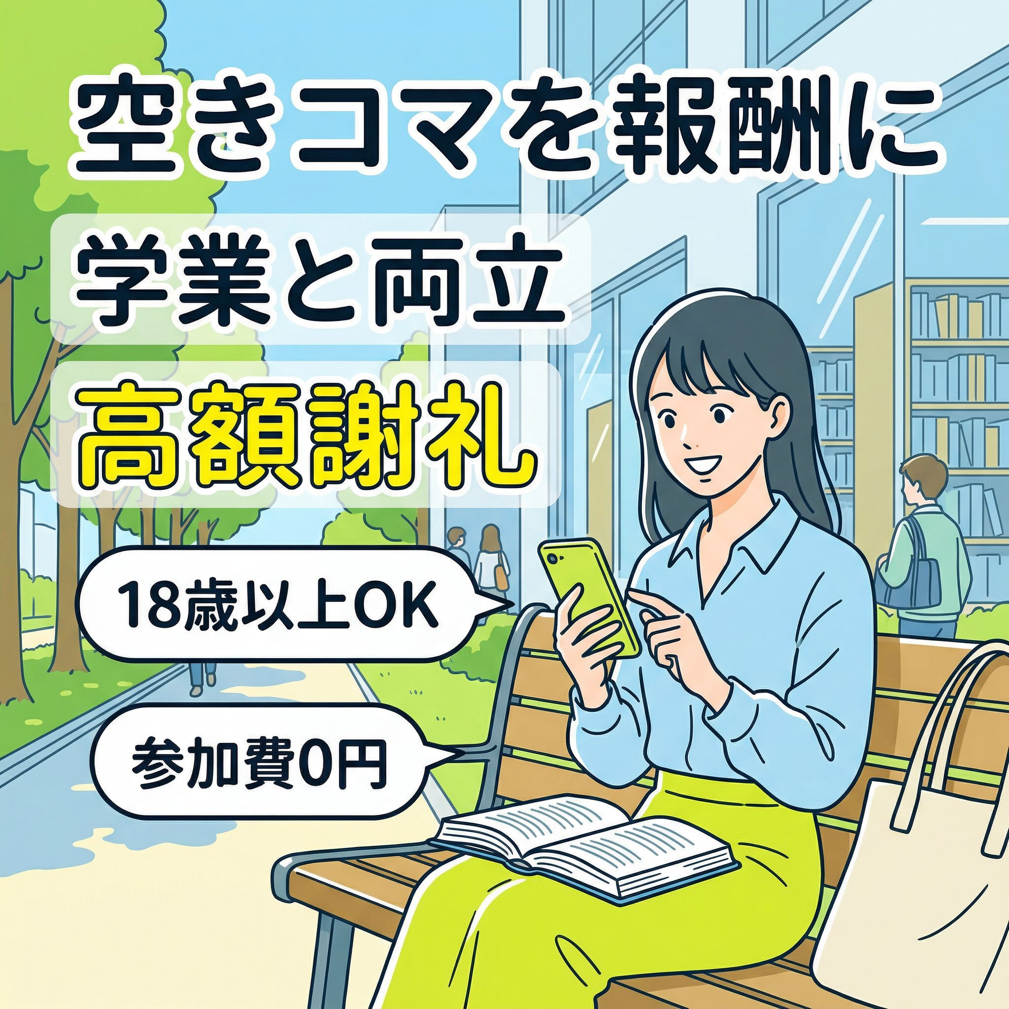 講義の空きコマにカフェでスマホを開く時間、通学時間の電車内でSNSを眺めている数十分。その何気ないスキマ時間は、視点を変えればそのまま報酬を生み出すチャンスになります。モニター体験は完全無料で参加でき、参加費0円のまま案件に応募できるため、思い立った瞬間に行動へ移せます。時間を切り売りするアルバイトとは異なり、自分の意見や感想を届けることで報酬や高額謝礼につながる仕組みは、効率を重視する学生にこそ相性が良い方法です。