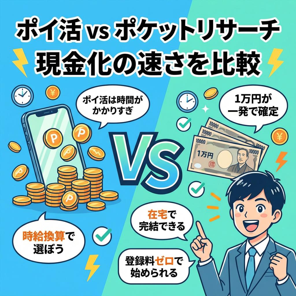 この記事では、多くの人が利用しているポイ活アプリと、いま注目されている在宅副業サービス「ポケットリサーチ」を、「現金化のスピード」という一点に絞って徹底比較する。