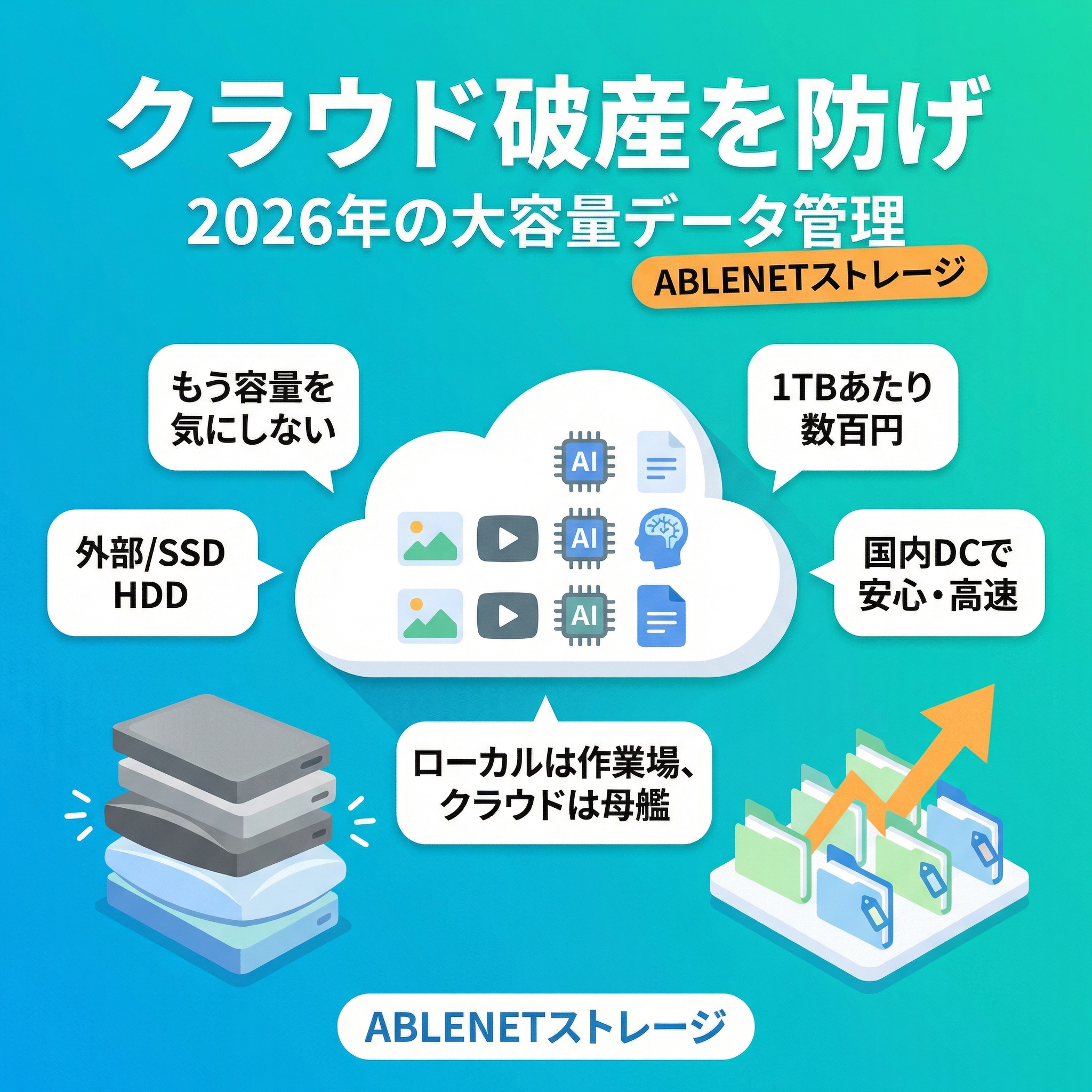 2026年、AIと共にコンテンツを生み出す時代において、ストレージは単なる裏方ではない。作業効率、コスト管理、および精神的な余裕に直結する重要なインフラだ。ABLENETストレージは、低コスト・大容量・高信頼という条件を満たし、「容量を気にしない」という理想的な環境を現実にしてくれる。クラウド破産を防ぎ、スマートなデータ運用を実現する。その第一歩として、ABLENETストレージは極めて合理的な選択肢と言えるだろう。