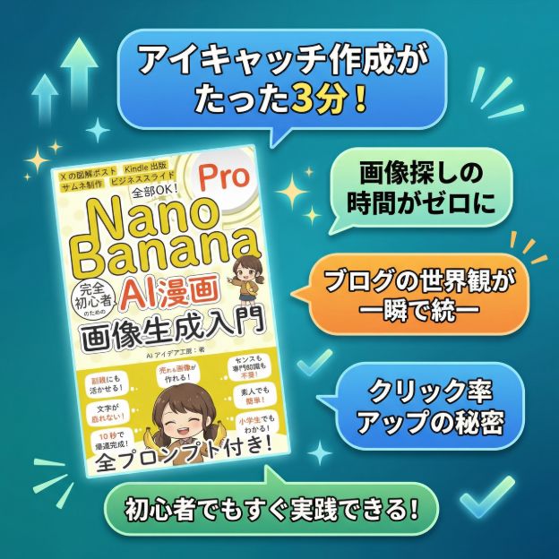 最新のnano banana系モデルは、日本語プロンプトへの理解力が飛躍的に向上しています。つまり、専門的な英語や難しい指示を覚えなくても、「明るい未来感」「スマホで目立つデザイン」「白背景のブログに映える色」といった日本語の指示だけで、狙い通りの画像が出力されるのです。重要なのは操作スキルではなく、「どんな画像を作りたいかを言語化する力」です。これが画像生成プロンプトの本質です。この力が身につくと、アイキャッチだけでなく、図解、SNS投稿画像、サムネイルまで一気に作れるようになります。