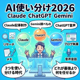AI活用・ツール術 毎日AIを使い倒している私が本音で語る——Claude・ChatGPT・Gemini、2026年の使い分けリアル PR「ChatGPTとGemini、どっちを使えばいいですか?」この質問、正直に言うと少しズレている。2026年現在、AIは「どれか一つを選ぶもの」ではなくなっているからだ。私は毎日複数のAIを使い分けながら、ブログ記事の制作・PC訪問サポ... 2026.02.05 AI活用・ツール術