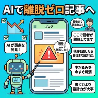 AIブログ運営術 「読者はここで飽きます」AIに記事の離脱ポイントを予測させて、最後まで読まれる文章構成に変える方法 PRあなたの記事、途中で読まれていないかもしれない記事を書き上げたとき、達成感がある。時間をかけて調べて、構成を考えて、何度も読み返して仕上げた記事だ。でも、その記事は本当に最後まで読まれているだろうか。Google アナリティクスのスクロ... 2026.03.15 AIブログ運営術