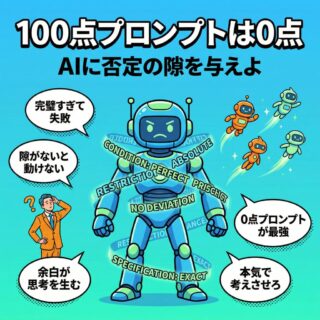 AI活用・ツール術 100点満点のプロンプトは0点である――AIに「否定の隙」を与えると、思考が10倍深まる PR「もっと詳しく書けば、もっといい答えが返ってくるはずだ」そう信じて、プロンプトに条件を足し、背景を足し、制約を足し続けた結果――AIは完璧に、あなたの期待通りの答えを返してくる。それが問題だ。期待通りの答えは、あなたがすでに知っている答... 2026.04.02 AI活用・ツール術