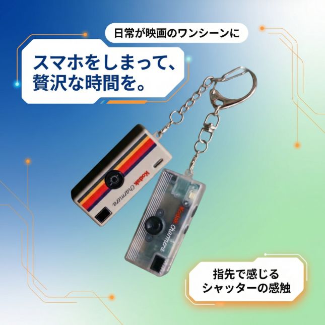 KODAK CHARMERAは、高性能カメラの代替ではありません。むしろその対極にある存在です。けれど、この小さなカメラは、何気ない日常を宝物に変えてくれる力を持っています。バッグにぶら下げて、ふとした瞬間に撮る。その繰り返しが、やがて愛おしい記憶になっていきます。CHARMERAはカメラというより、「体験を持ち歩くためのバッグチャーム」なのです。