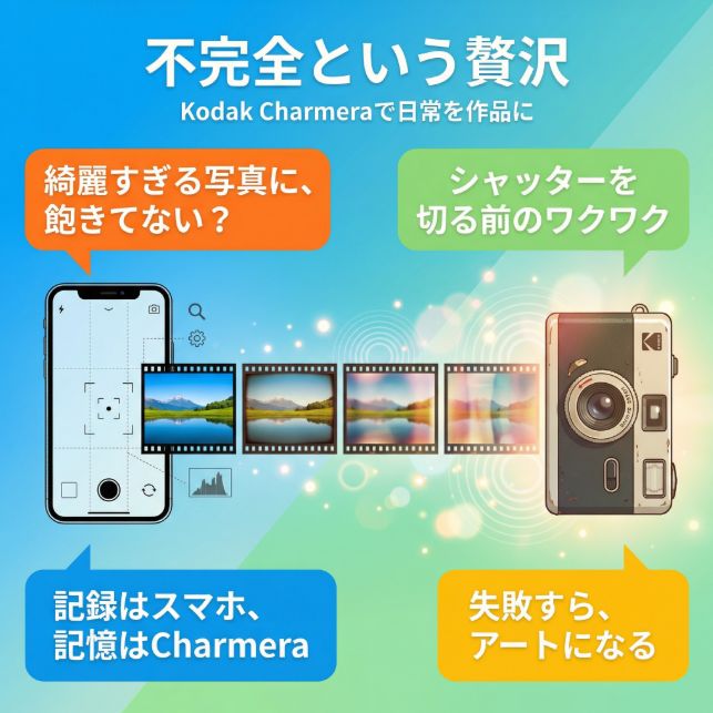 カメラを買うというより、「おもちゃを開ける」感覚。開封の瞬間からすでに体験が始まっているのです。そして、その小さなカメラで撮る一枚一枚が、どこか愛おしく感じられてきます。性能ではなく、体験で選ぶカメラ。それがKODAK CHARMERAの最大の魅力なのです。