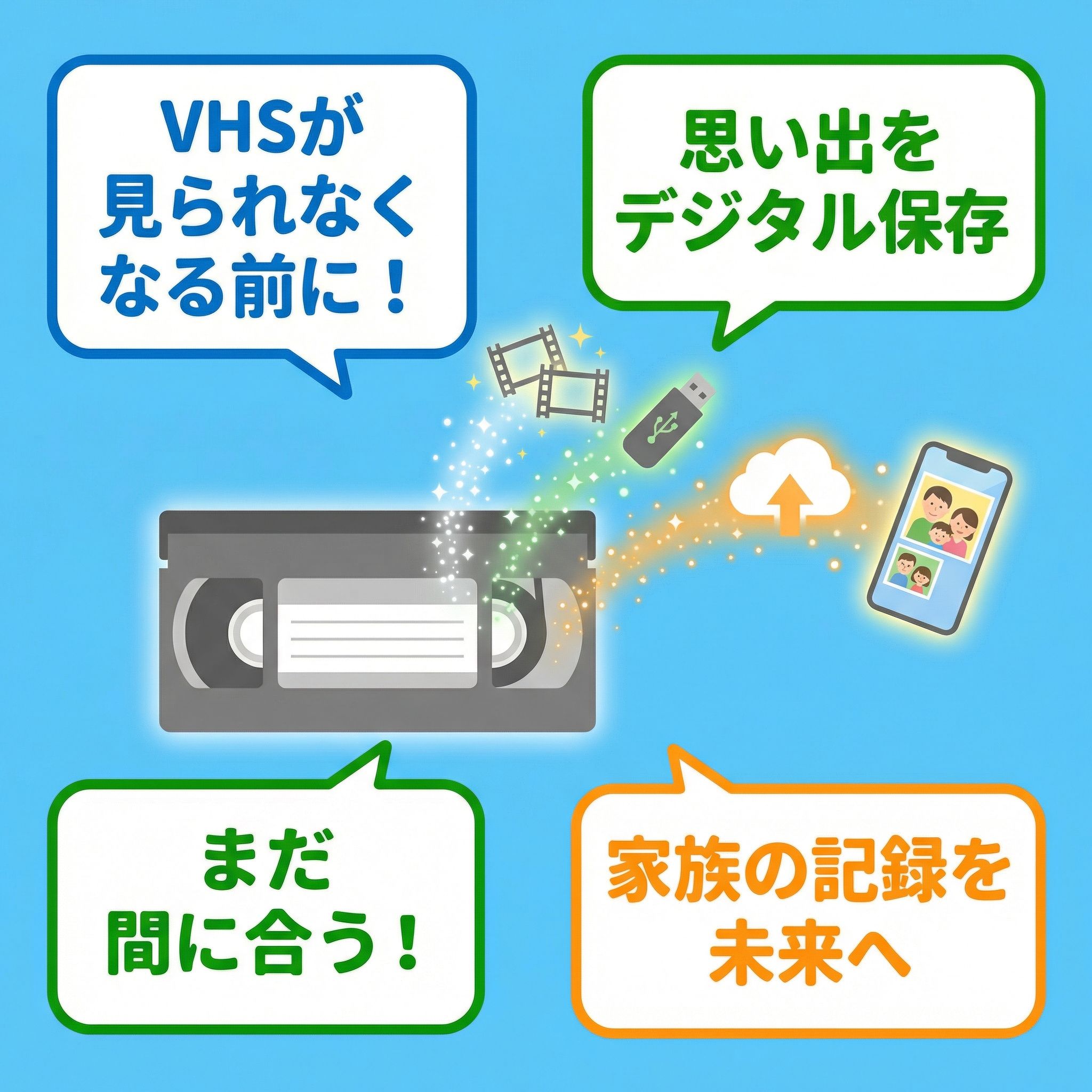 形あるものは、いつか必ず壊れます。けれど、データにしてしまえば、家族の歴史は世代を超えて繋いでいけます。押し入れの奥にあるテープは、過去ではなく、未来へ渡すバトンです。