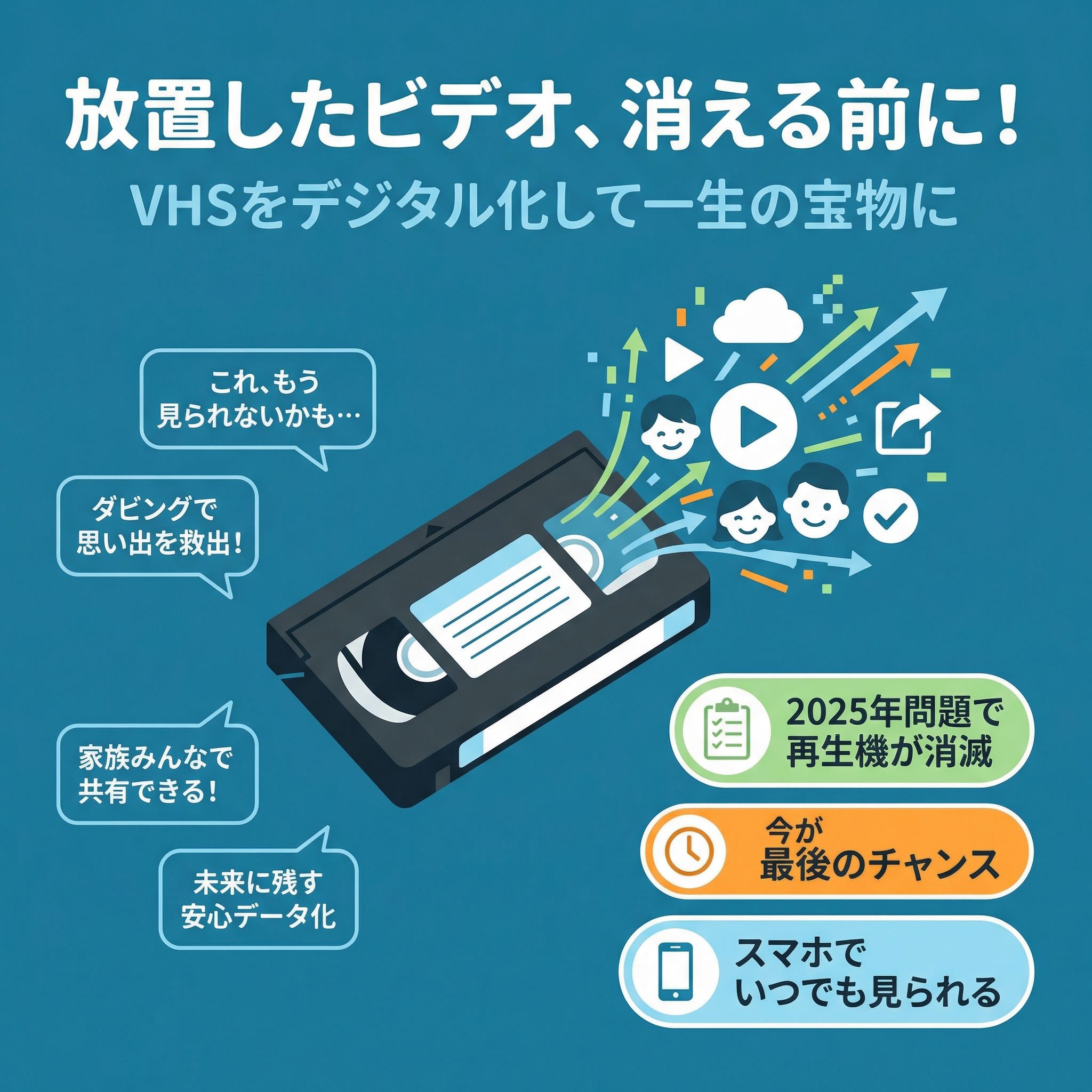 ビデオテープは、あなたが何もしなくても確実に劣化していきます。再生できたはずの映像が砂嵐に変わり、やがて二度と見られなくなる日が来ます。しかし、今デジタル化すれば、その映像は一生の宝物になります。未来の自分や家族にとって、それはかけがえのない贈り物になります。